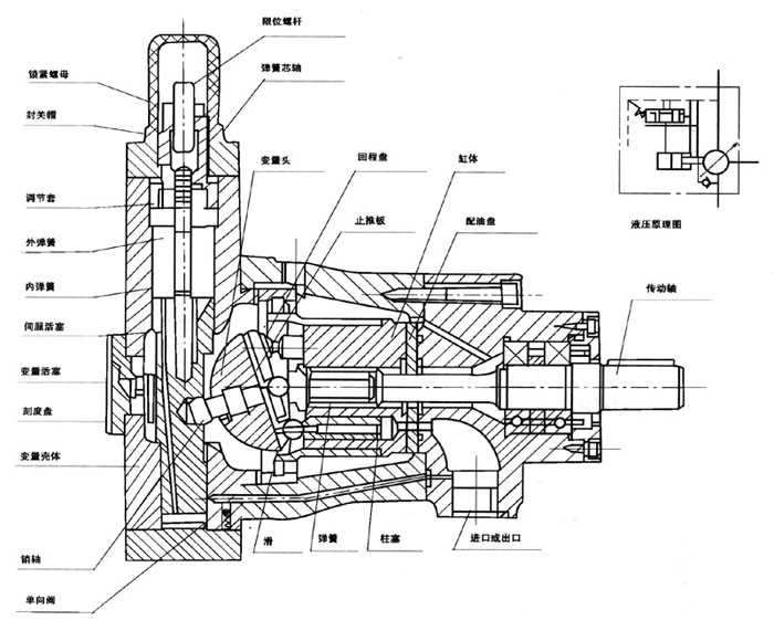 该种变量形式的轴向柱塞泵是靠泵本身压力自动控制,如上图高压油流通过通道(a)、(b)、(c),进入变量壳体(302)的下腔(d),由此经过通道(e)